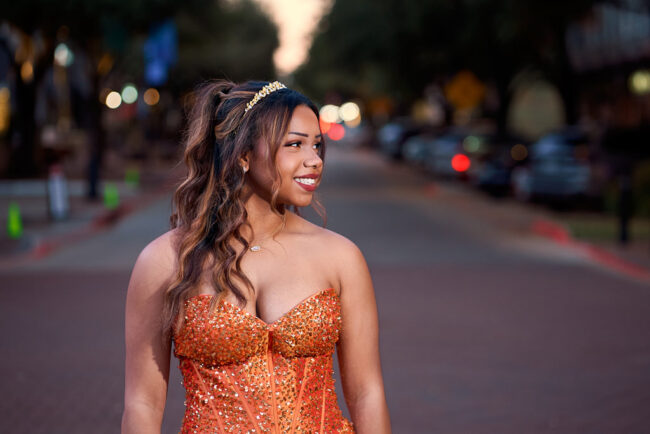 My daughter Elaina was attending a military ball with her boyfriend, Bryan, but since it was out of town, she asked if we could do her photos a few days beforehand. She wanted to shoot at Legacy West in Plano to take advantage of the Christmas decorations and the illuminated fountain. Shooting in the evening…